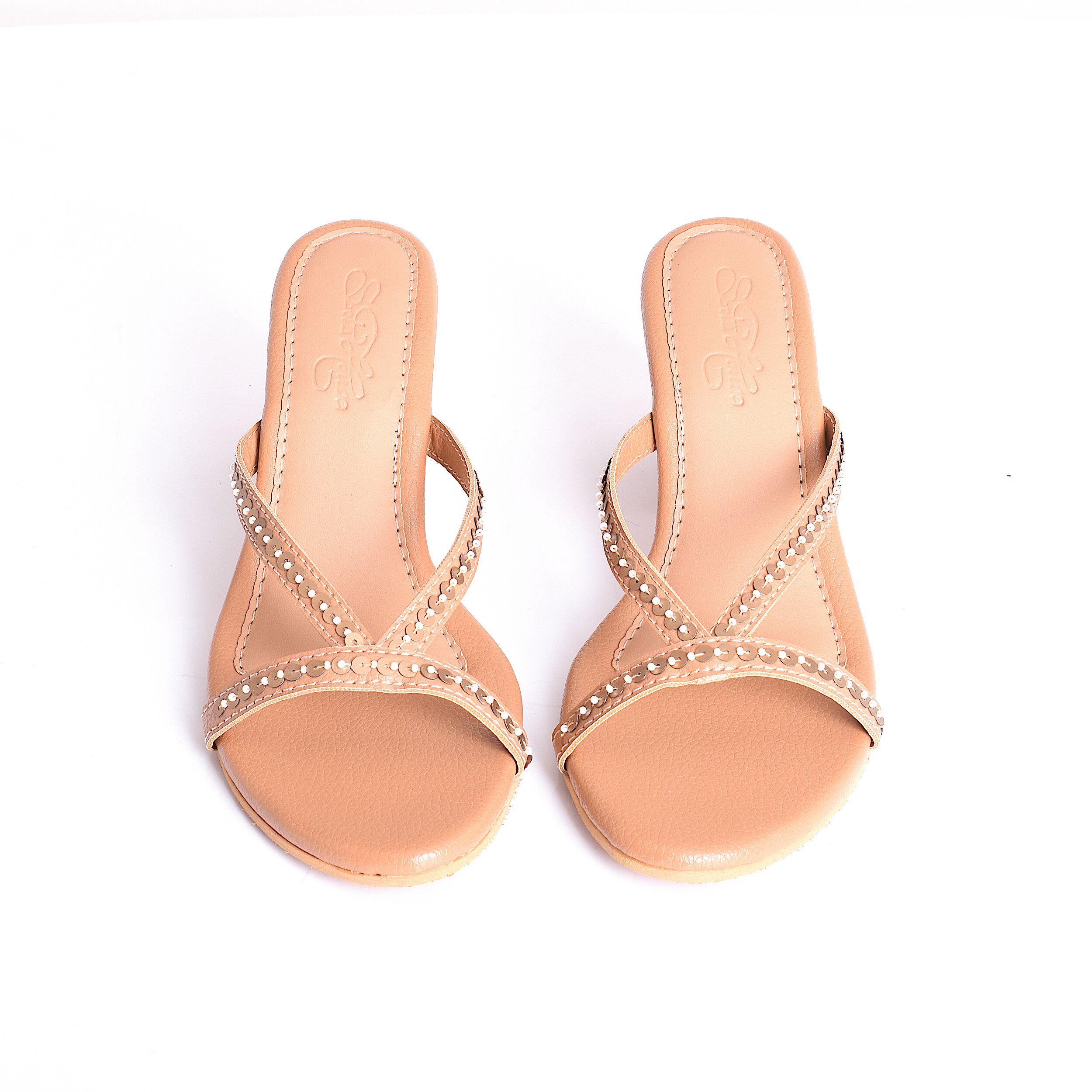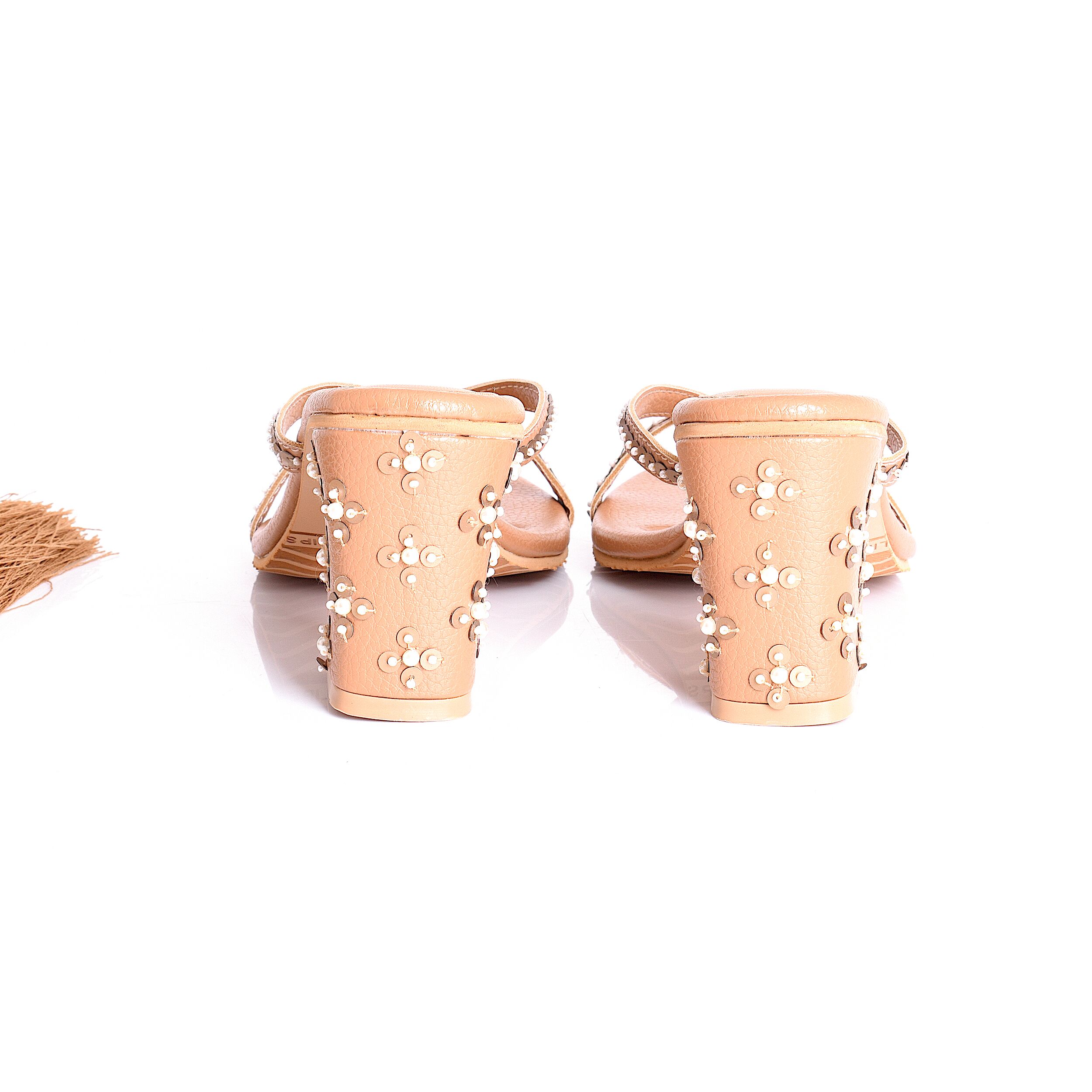Strappy Beige Vegan Leather with Gold Tiki and Creme Bead embroidery, with Embroidery on Slender 3-inch Heel.